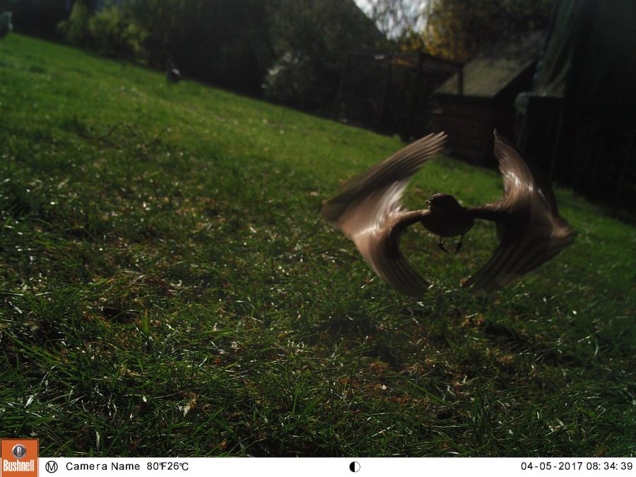 This house sparrow was caught on our Bushnell nature cam, seed in her mouth, her relaxed feet hanging loose as her wings do what comes naturally to them, beating perhaps fifteen times a second. These short wings allow for a quick lift off, though she’s not built for speed, rather a swift exit when the neighbourhood cats are out. For once the humble sparrow looked exotic to me, like a new species of bat or four-winged bird.